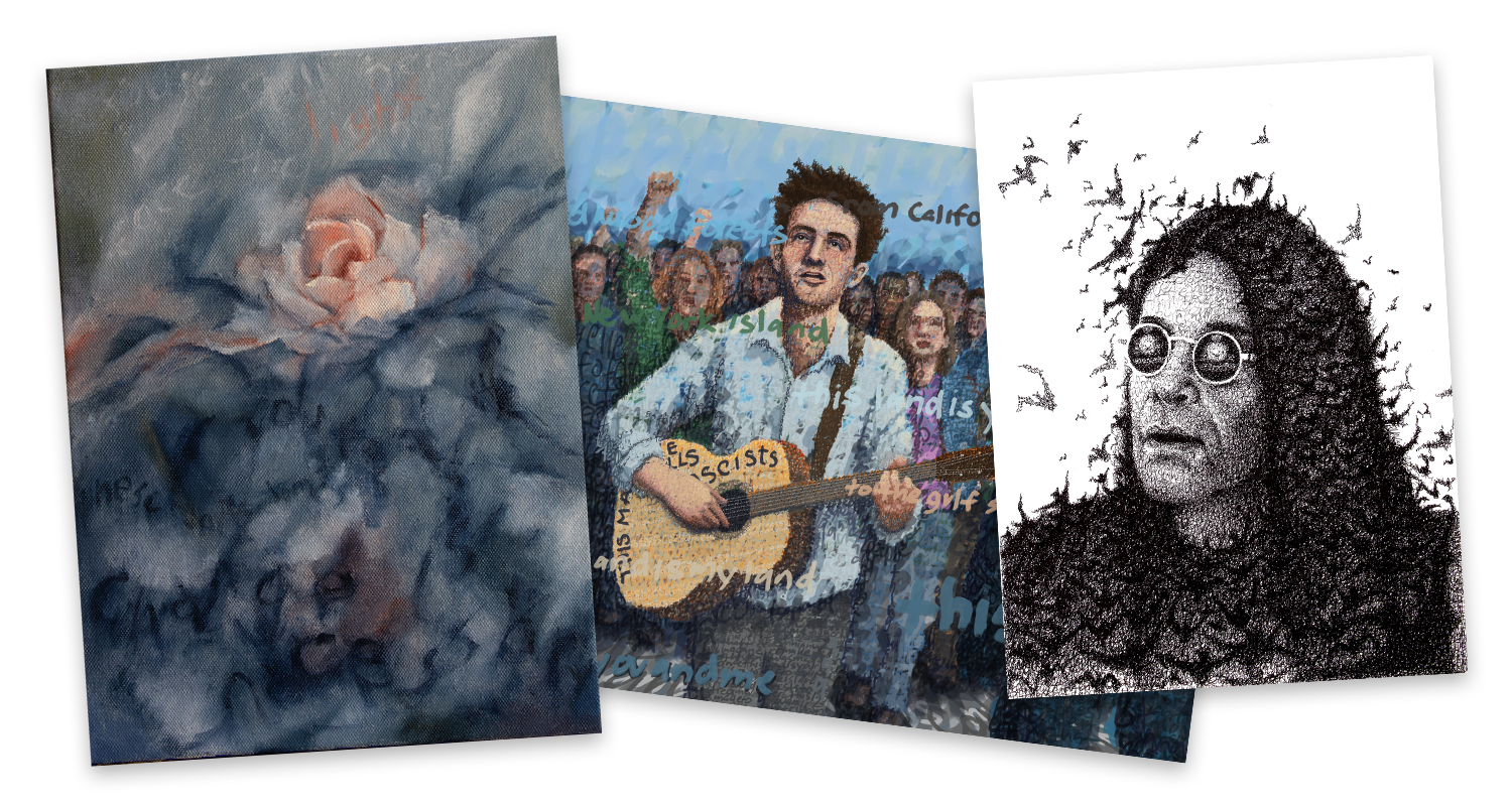 Portraits that preserve legacy. Beyond likeness, I weave your words, thoughts, and feelings into surfaces where language and image merge. Each portrait is your story—your memories made art.